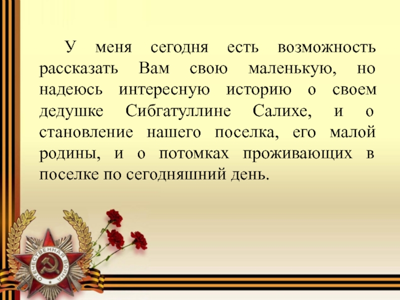 интересную историю о своем дедушке Сибгатуллине Салихе, и о становление нашего поселка, его малой родины, и о потомках проживающих в поселке по сегодняшний день.