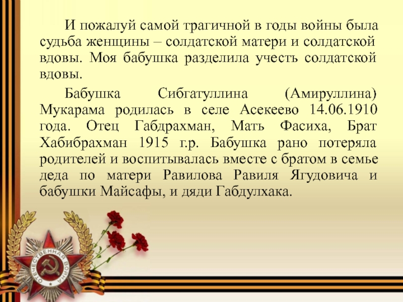 солдатской матери и солдатской вдовы. Моя бабушка разделила учесть солдатской вдовы.