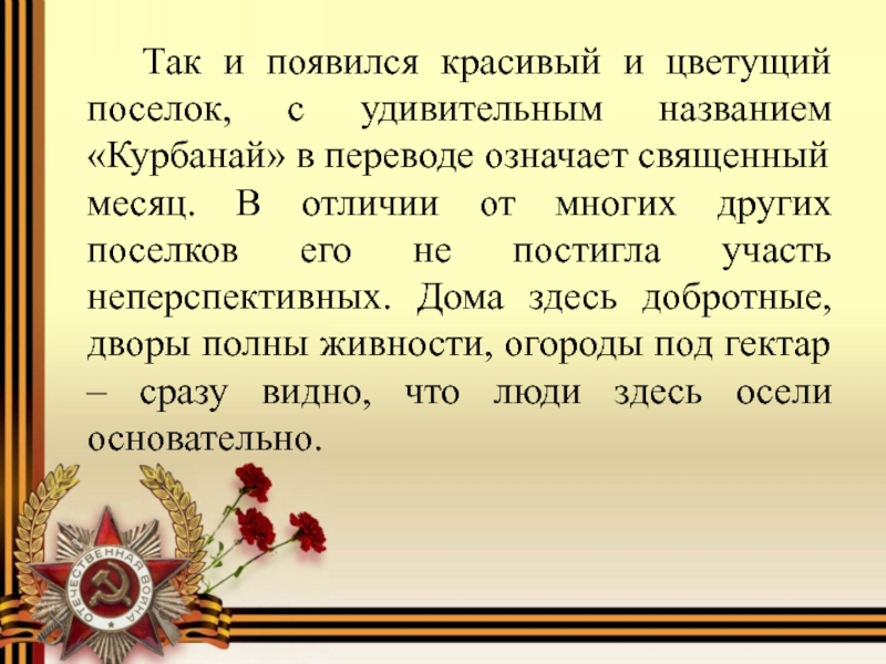 Слайд 5 Так и появился красивый и цветущий поселок, с удивительным названием «Курбанай»