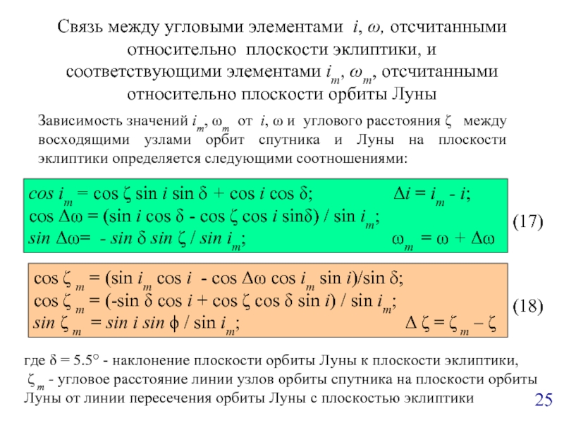 Зависимость значений im, ωm от i, ω и углового расстояния ζ между восходящими узлами орбит спутника и Луны на плоскости эклиптики определяется следующими соотношениями: