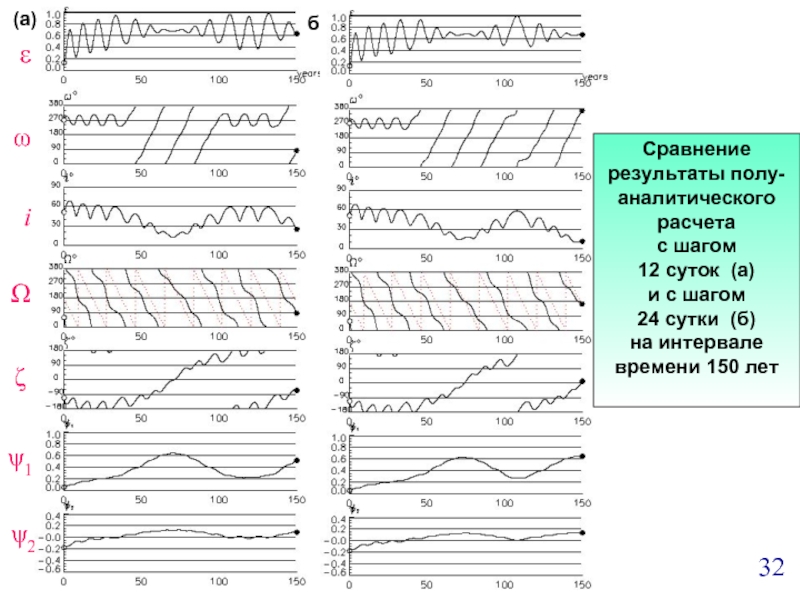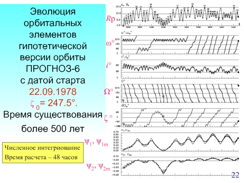 На следующих слайдах на примере орбиты типа ПРОГНОЗ-6 с гипотетическим стартом в 1978 году приводится сопоставление результатов полуаналитического расчета эволюции орбитальных элементов и результатов численного интегрирования на интервале времени 150 лет.