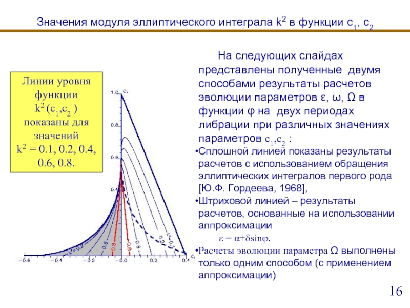 Значения модуля эллиптического интеграла k2 в функции с1, с2