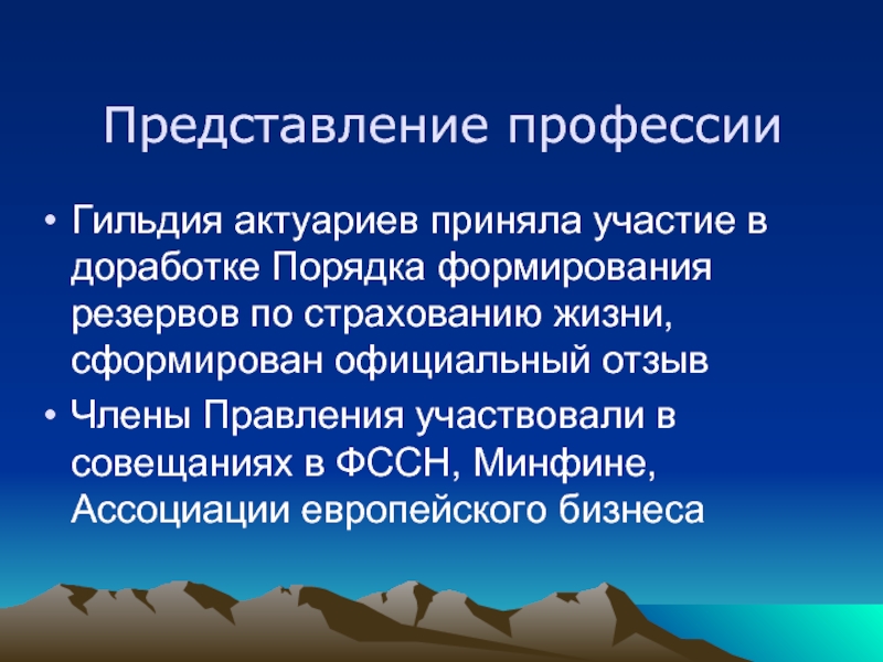 Гильдия актуариев приняла участие в подготовке и обсуждении законопроекта (Комитет Госдумы по финансовым рынкам), вводящего понятие назначенного актуария, закрепляющего функцию аттестации за профессиональным объединением актуариев и т.д.
