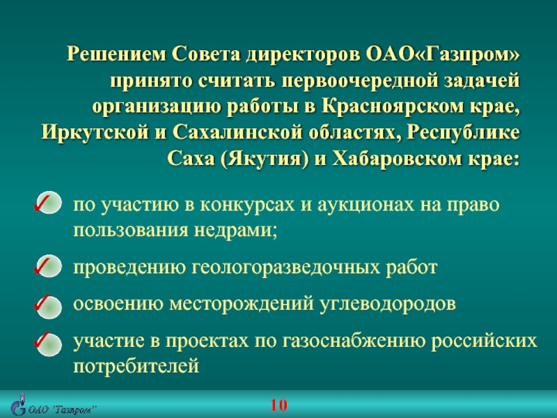 Решением Совета директоров ОАО«Газпром» принято считать первоочередной задачей организацию работы в Красноярском крае, Иркутской и Сахалинской областях, Республике Саха (Якутия) и Хабаровском крае: