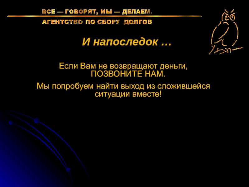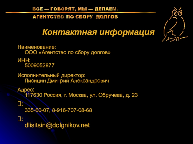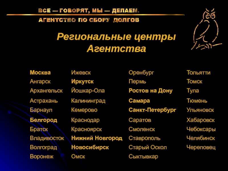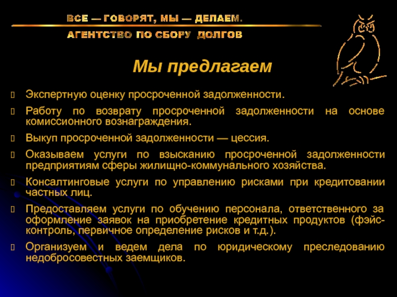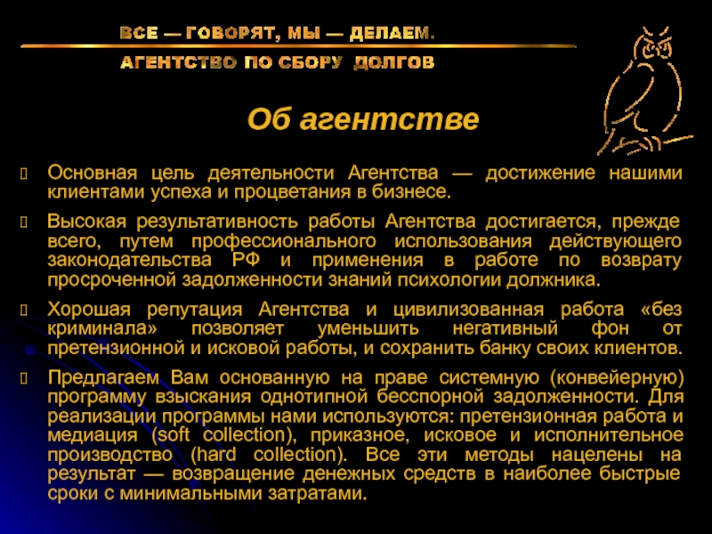 Высокая результативность работы Агентства достигается, прежде всего, путем профессионального использования действующего законодательства РФ и применения в работе по возврату просроченной задолженности знаний психологии должника.