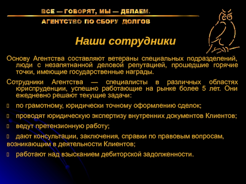 Основу Агентства составляют ветераны специальных подразделений, люди с незапятнанной деловой