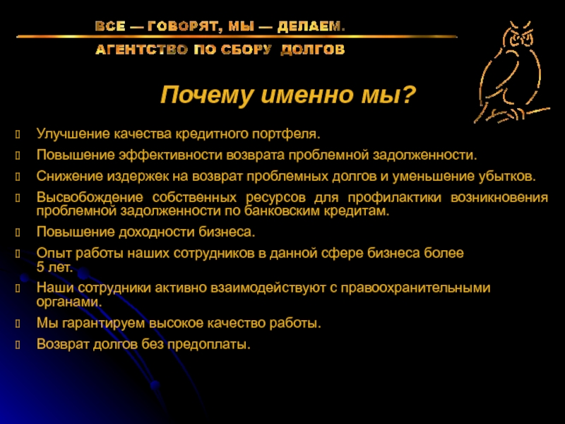 Хорошая репутация Агентства и цивилизованная работа «без криминала» позволяет уменьшить негативный фон от претензионной и исковой работы, и сохранить банку своих клиентов.