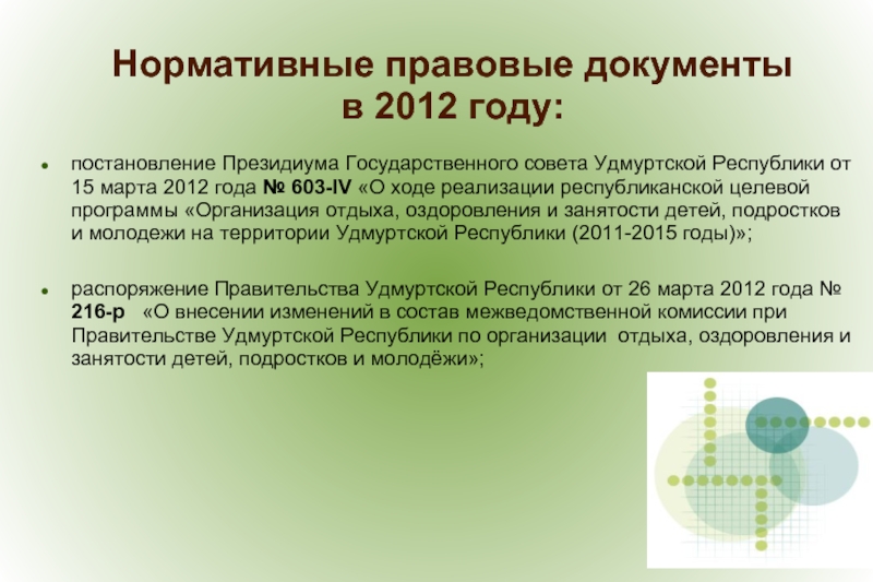 постановление Правительства Удмуртской Республики от 05 марта 2012 года № 72 «О внесении изменений в постановление Правительства Удмуртской Республики от 30 мая 2011 года № 170 «Об утверждении республиканской целевой программы «Организация отдыха, оздоровления и занятости детей, подростков и молодежи на территории Удмуртской Республики (2011-2015 годы)»;