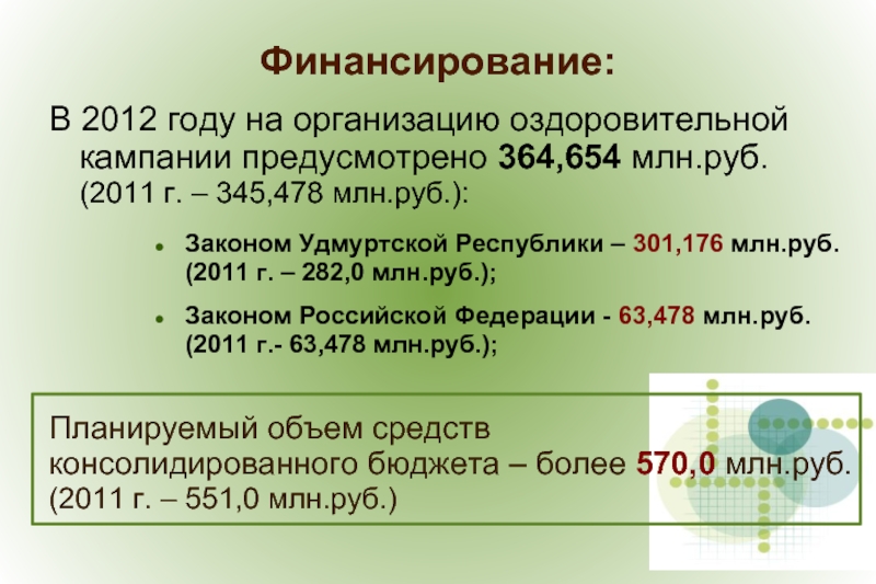 Планируемый объем средств консолидированного бюджета – более 570,0 млн.руб. (2011 г. – 551,0 млн.руб.)