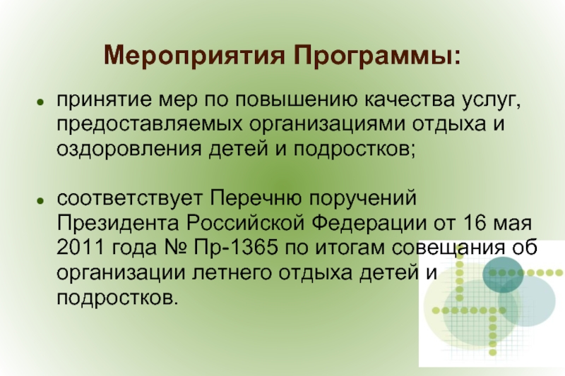 от 16 мая 2011 года № Пр-1365 по итогам совещания об организации летнего отдыха детей и подростков»
