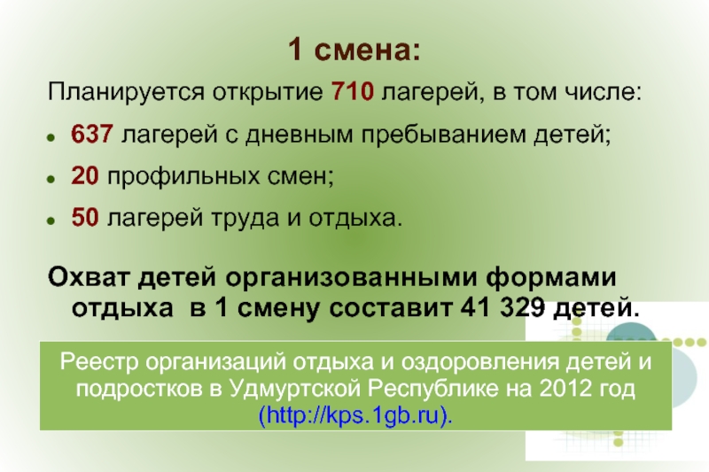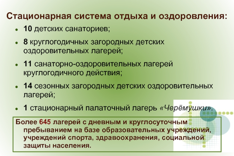 Более 645 лагерей с дневным и круглосуточным пребыванием на базе образовательных учреждений, учреждений спорта, здравоохранения, социальной защиты населения.