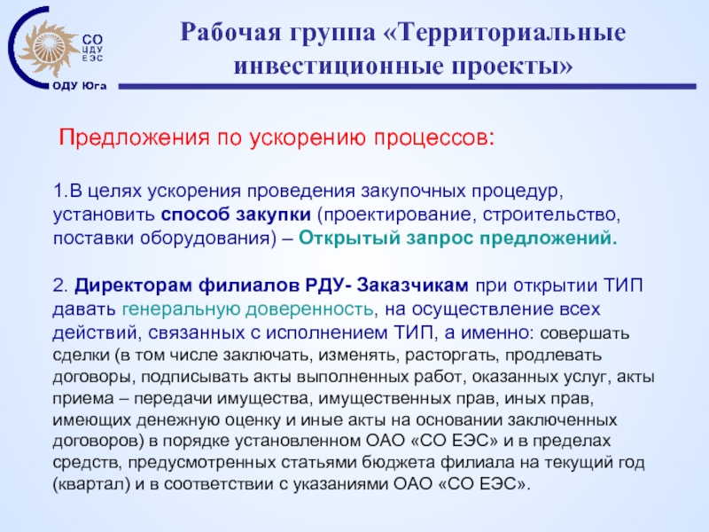 2. Директорам филиалов РДУ- Заказчикам при открытии ТИП давать генеральную доверенность, на осуществление всех действий, связанных с исполнением ТИП, а именно: совершать сделки (в том числе заключать, изменять, расторгать, продлевать договоры, подписывать акты выполненных работ, оказанных услуг, акты приема – передачи имущества, имущественных прав, иных прав, имеющих денежную оценку и иные акты на основании заключенных договоров) в порядке установленном ОАО «СО ЕЭС» и в пределах средств, предусмотренных статьями бюджета филиала на текущий год (квартал) и в соответствии с указаниями ОАО «СО ЕЭС».