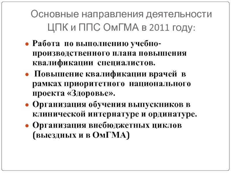 Слайд 2Основные направления деятельности ЦПК и ППС ОмГМА в 2011 году: