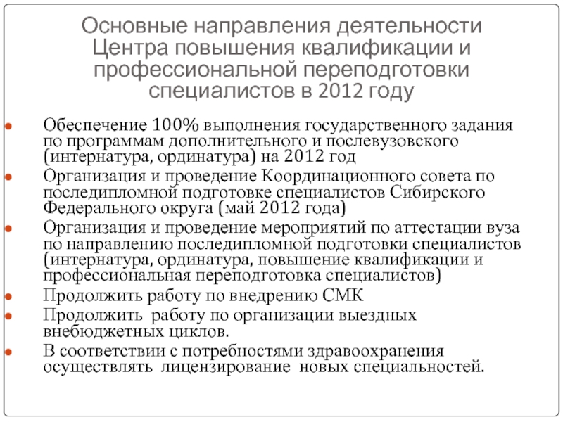 Слайд 21Основные направления деятельности Центра повышения квалификации и профессиональной переподготовки специалистов в