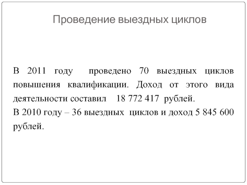 В 2010 году – 36 выездных циклов и доход 5 845 600 рублей.