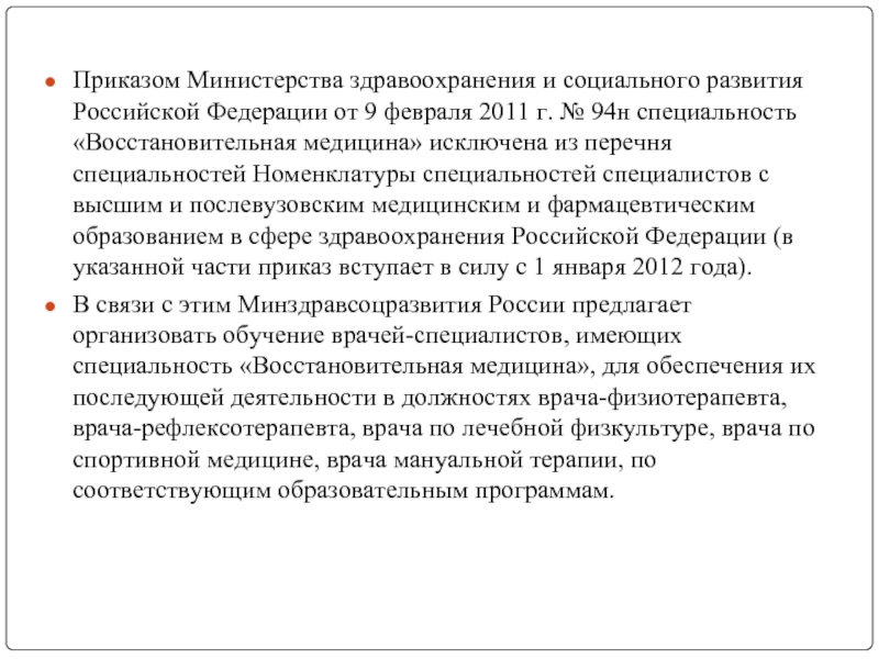 2011 г. № 94н специальность «Восстановительная медицина» исключена из перечня специальностей Номенклатуры специальностей специалистов с высшим и послевузовским медицинским и фармацевтическим образованием в сфере здравоохранения Российской Федерации (в указанной части приказ вступает в силу с 1 января 2012 года).