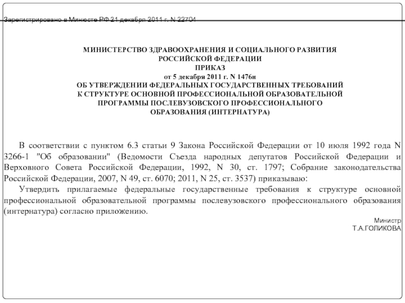 Слайд 19Зарегистрировано в Минюсте РФ 21 декабря 2011 г. N 22704