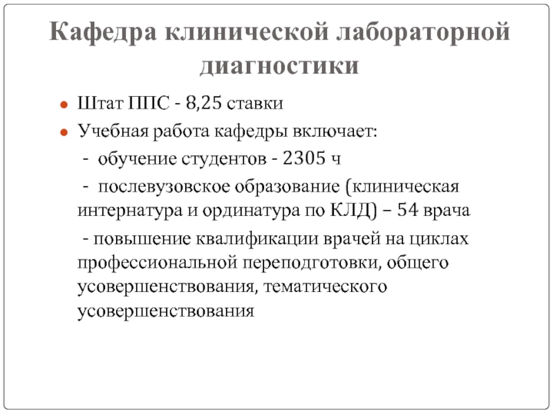 - послевузовское образование (клиническая интернатура и ординатура по КЛД) – 54 врача