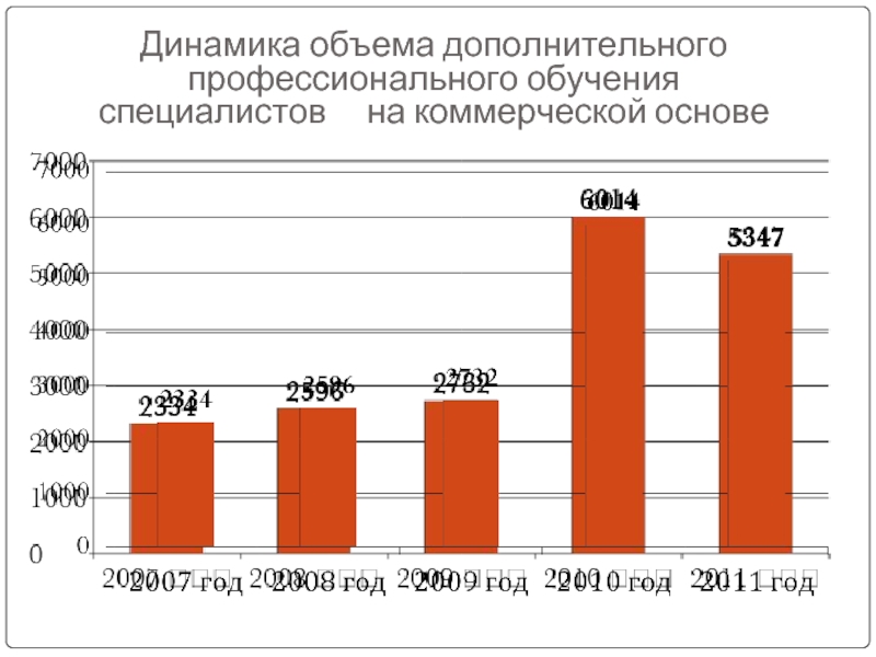 Слайд 6Динамика объема дополнительного профессионального обучения специалистов на коммерческой основе