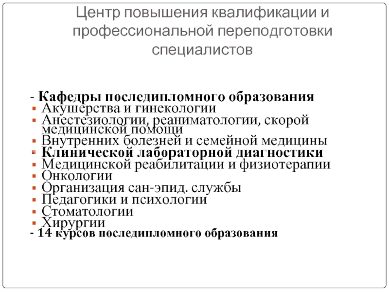 - повышение квалификации врачей на циклах профессиональной переподготовки, общего усовершенствования, тематического усовершенствования
