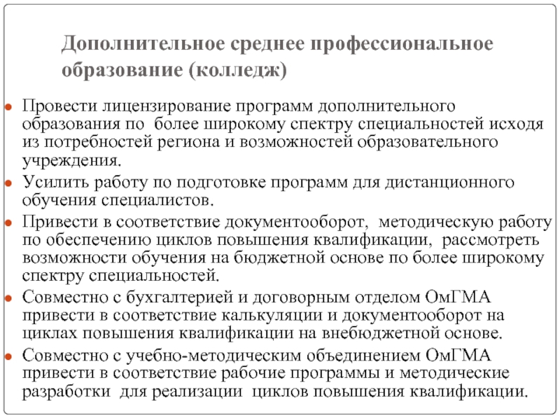 Привести в соответствие документооборот, методическую работу по обеспечению циклов повышения квалификации, рассмотреть возможности обучения на бюджетной основе по более широкому спектру специальностей.