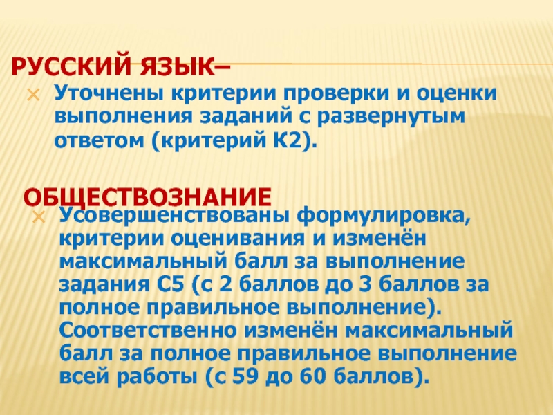 Усовершенствованы формулировка, критерии оценивания и изменён максимальный балл за выполнение задания С5 (с 2 баллов до 3 баллов за полное правильное выполнение). Соответственно изменён максимальный балл за полное правильное выполнение всей работы (с 59 до 60 баллов).