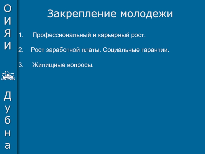 Закрепление молодежи (социальные программы) . Объединение молодых ученых и специалистов.