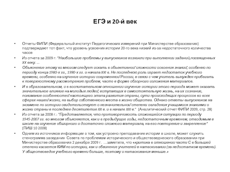 И в образовательном, и в воспитательном отношении изучение истории этого периода может оказать значительное влияние на молодых людей, вступающих в самостоятельную жизнь, на их сознание, понимание особенностей настоящего этапа развития страны, сути происходящих процессов во всех сферах нашей жизни, на выбор собственного места в жизни общества. Однако ответы выпускников на экзамене по истории свидетельствуют о незначительной степени овладения учащимися знаниями о жизни страны в последнее десятилетие XX в. и в начале XXI в.” (Аналитический отчет ФИПИ 2009, стр. 28)