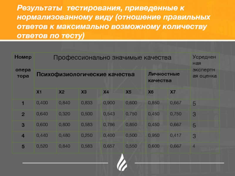 Слайд 13Результаты тестирования, приведенные к нормализованному виду (отношение правильных ответов к максимально