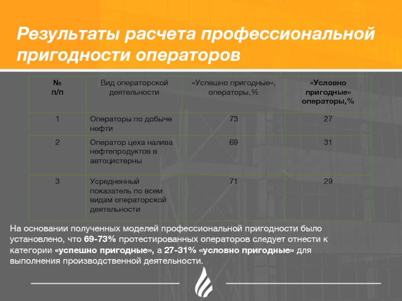 Слайд 19Результаты расчета профессиональной пригодности операторов