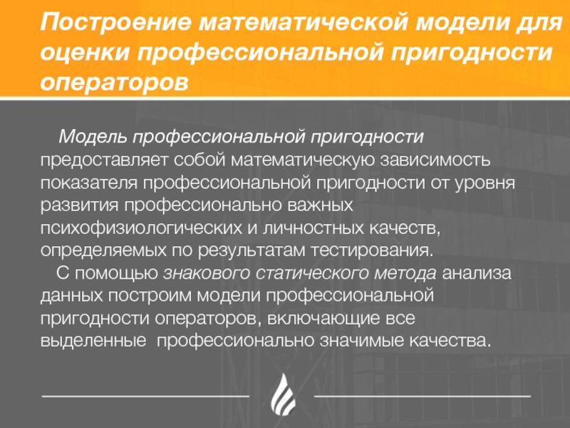 Слайд 10Построение математической модели для оценки профессиональной пригодности операторов
