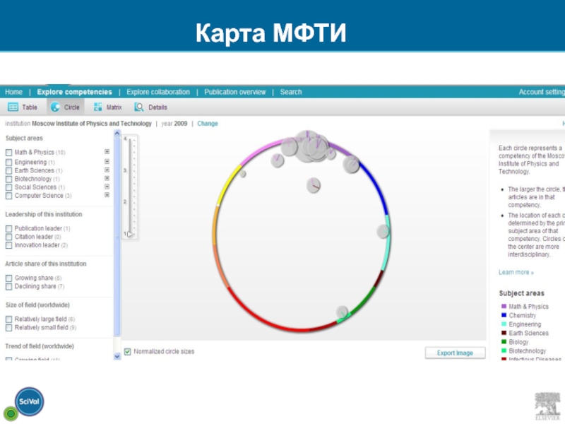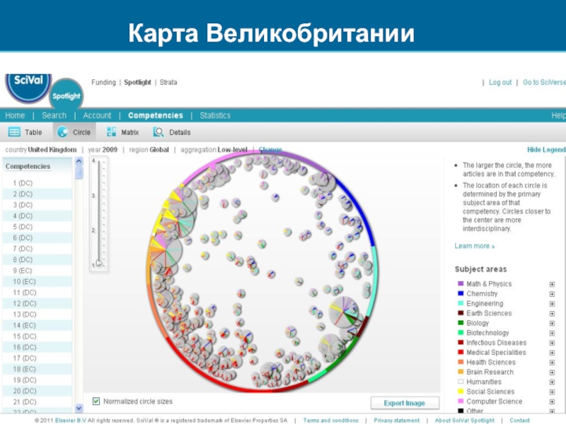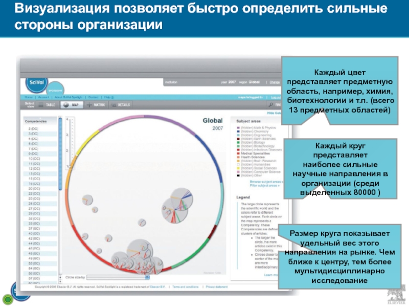 Размер круга показывает удельный вес этого направления на рынке. Чем ближе к центру, тем более мультидисциплинарно исследование