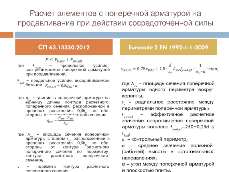 Fsw,ult, Msw,x,ult, Msw,y,ult – предельные сосредоточенные сила и изгибающие моменты в направлениях X и Y, которые могут быть восприняты поперечной арматурой при их раздельном действии