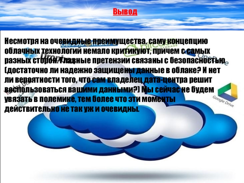 Облачные технологии – форма обработки данных, в которой компьютерные ресурсы предоставляются пользователю как Интернет-сервис. Пользователь имеет доступ к собственным данным, но не может управлять и не должен заботиться об инфраструктуре, операционной системе и собственно программном обеспечении