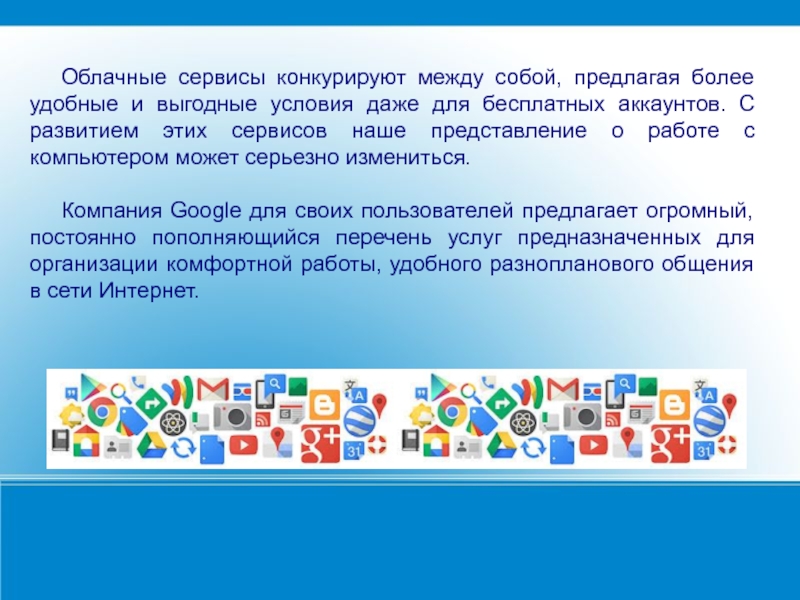 Компания Google для своих пользователей предлагает огромный, постоянно пополняющийся перечень услуг предназначенных для организации комфортной работы, удобного разнопланового общения в сети Интернет.