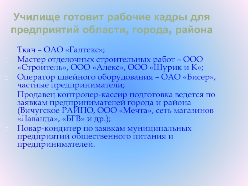 Слайд 10Училище готовит рабочие кадры для предприятий области, города, района