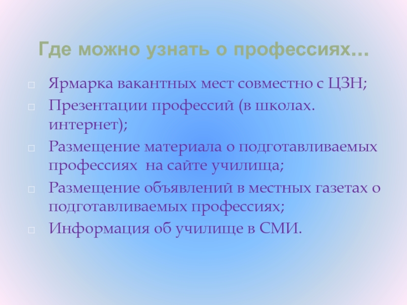 Размещение объявлений в местных газетах о подготавливаемых профессиях;