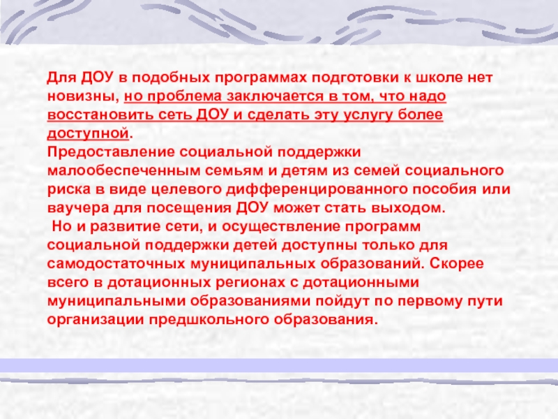 В целях снижения рисков недополучения услуг ДОУ для детей из малоимущих семей предлагается внедрить следующий подход к их финансированию: