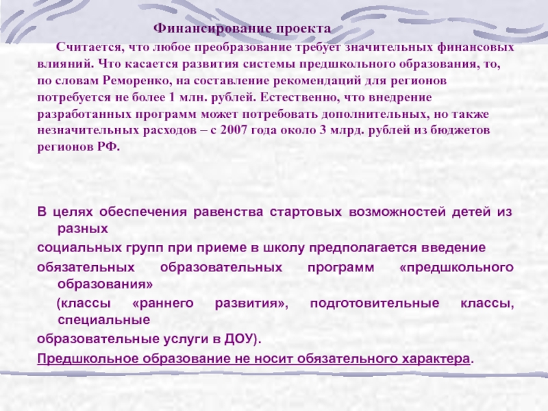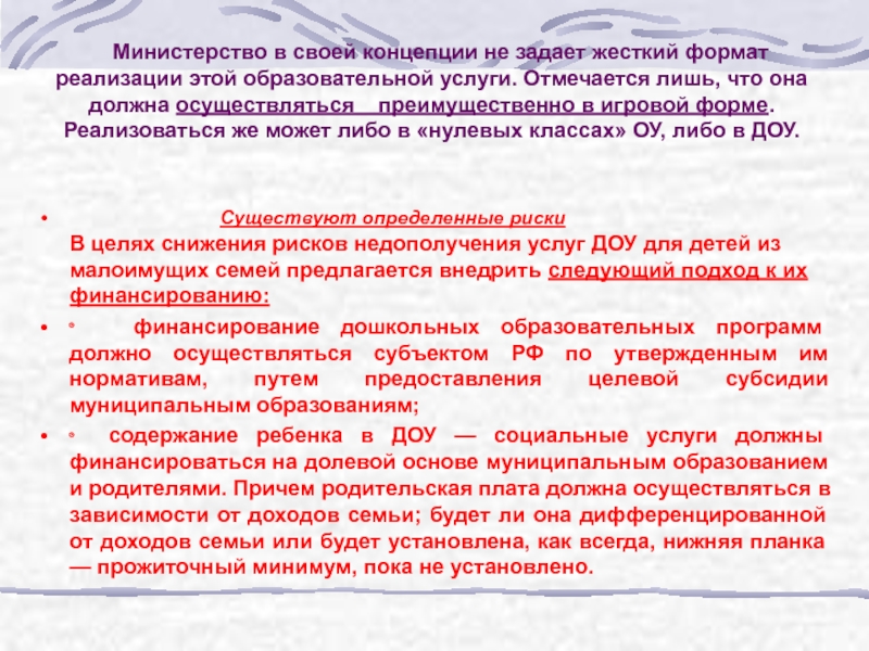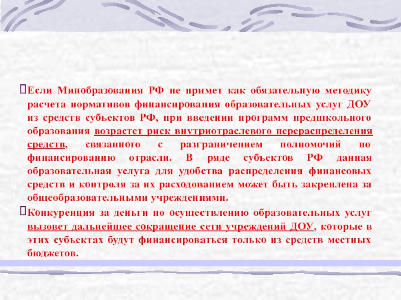 ∙ финансирование дошкольных образовательных программ должно осуществляться субъектом РФ по утвержденным им нормативам, путем предоставления целевой субсидии муниципальным образованиям;