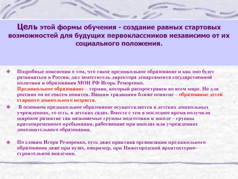 Подробные пояснения о том, что такое предшкольное образование и как оно будет развиваться в России, дал заместитель директора департамента государственной политики и образования МОН РФ Игорь Реморенко.