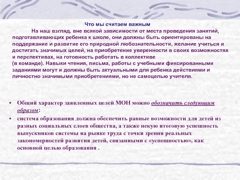 система образования должна обеспечить равные возможности для детей из разных социальных слоев общества, а также некую итоговую успешность выпускников системы на рынке труда с точки зрения реальных закономерностей развития детей, связанными с «успешностью», как основной целью образования .
