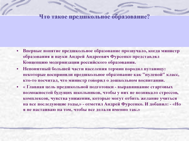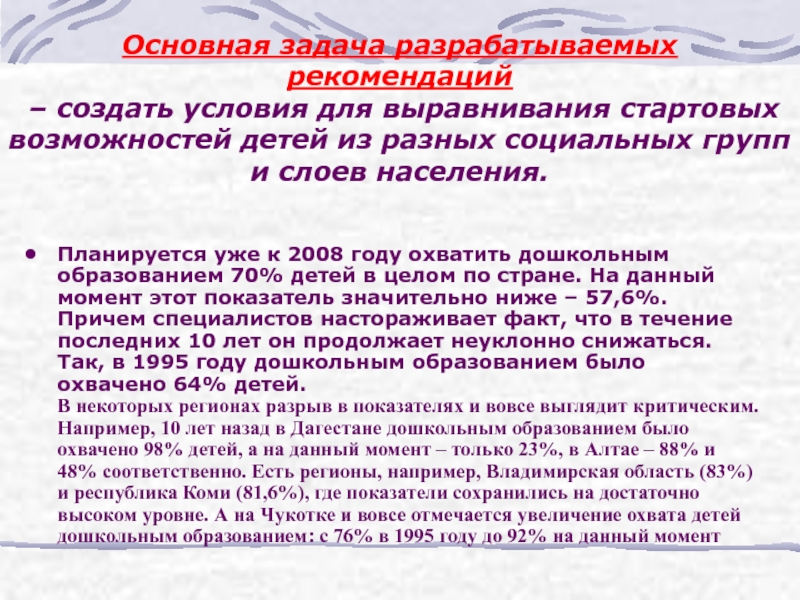 Планируется уже к 2008 году охватить дошкольным образованием 70% детей в целом по стране. На данный момент этот показатель значительно ниже – 57,6%. Причем специалистов настораживает факт, что в течение последних 10 лет он продолжает неуклонно снижаться. Так, в 1995 году дошкольным образованием было охвачено 64% детей.