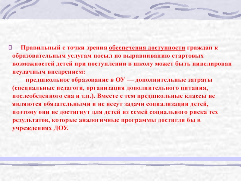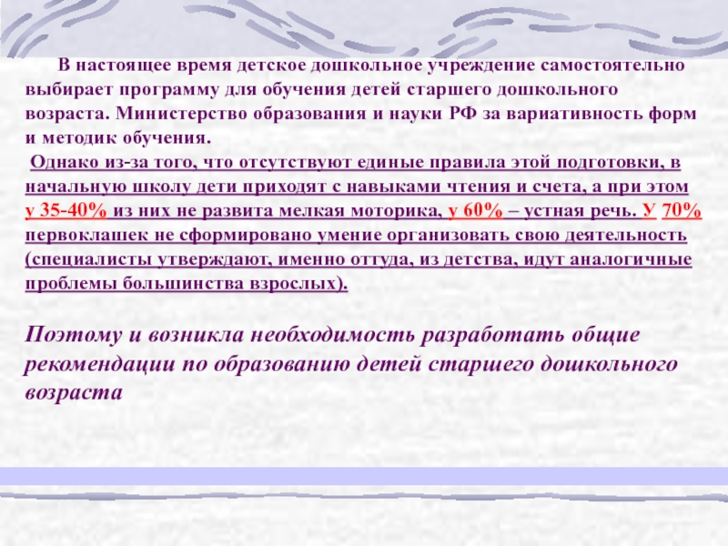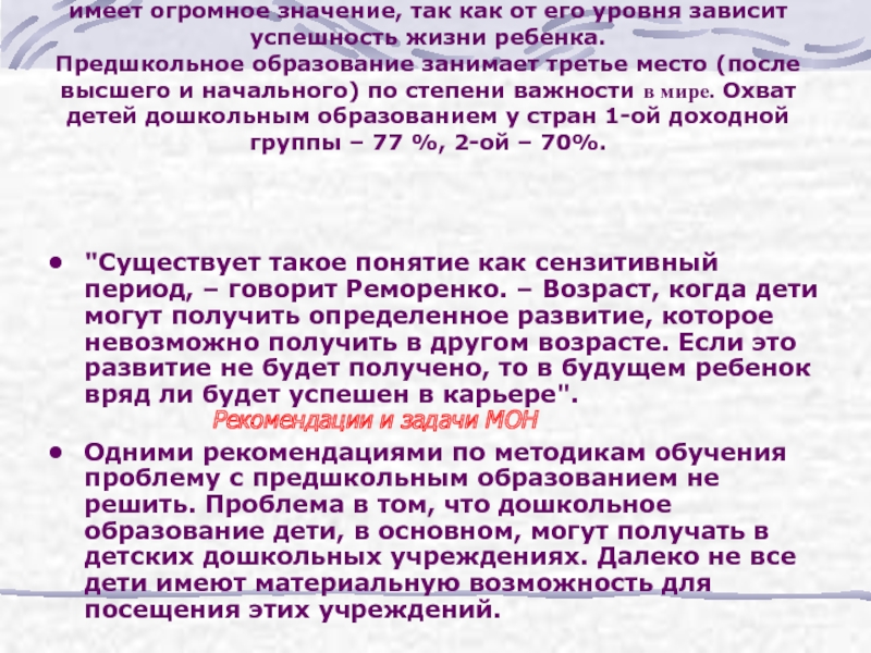 Одними рекомендациями по методикам обучения проблему с предшкольным образованием не решить. Проблема в том, что дошкольное образование дети, в основном, могут получать в детских дошкольных учреждениях. Далеко не все дети имеют материальную возможность для посещения этих учреждений.