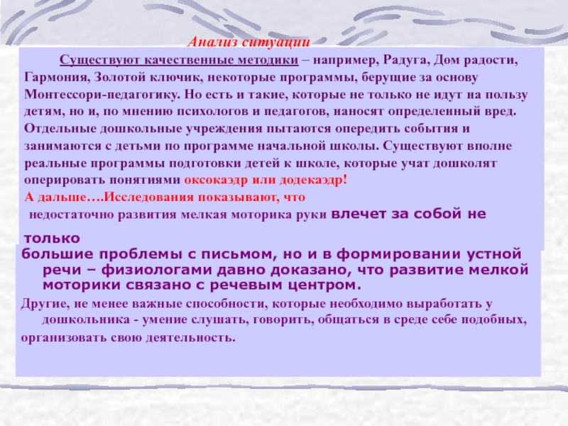 большие проблемы с письмом, но и в формировании устной речи – физиологами давно доказано, что развитие мелкой моторики связано с речевым центром.