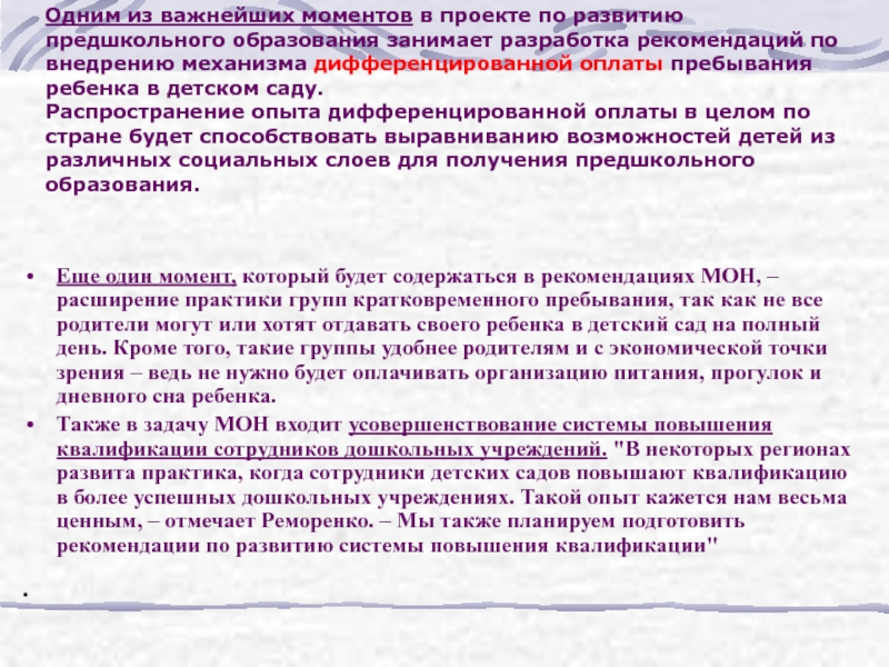 Также в задачу МОН входит усовершенствование системы повышения квалификации сотрудников дошкольных учреждений. "В некоторых регионах развита практика, когда сотрудники детских садов повышают квалификацию в более успешных дошкольных учреждениях. Такой опыт кажется нам весьма ценным, – отмечает Реморенко. – Мы также планируем подготовить рекомендации по развитию системы повышения квалификации"