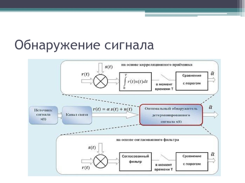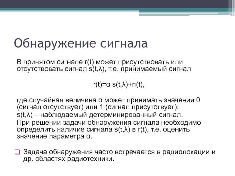 При решении задачи обнаружения сигнала необходимо определить наличие сигнала s(t,λ) в r(t), т.е. оценить значение параметра α.