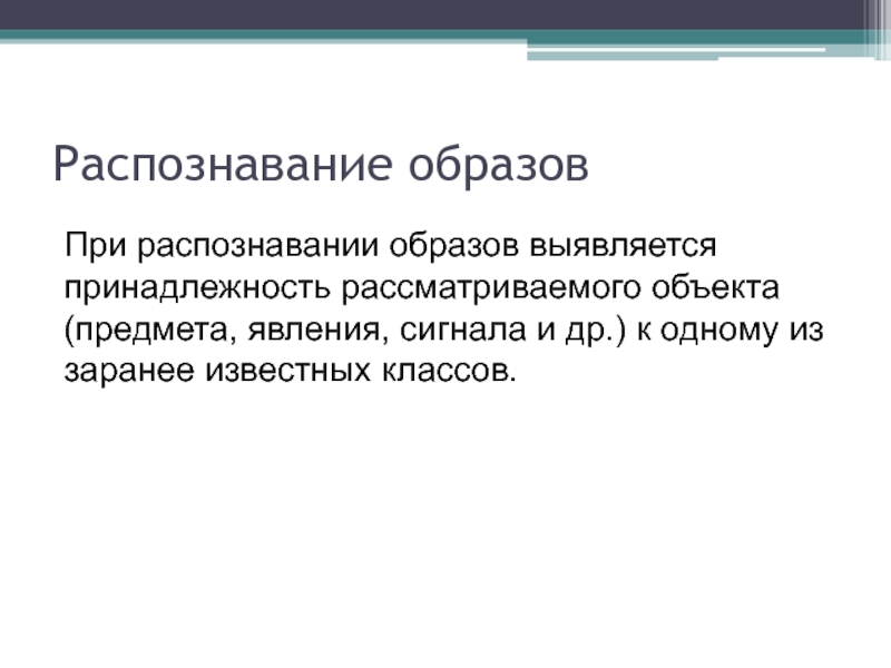 При распознавании образов выявляется принадлежность рассматриваемого объекта (предмета, явления, сигнала