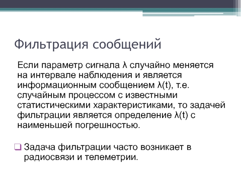 является информационным сообщением λ(t), т.е. случайным процессом с известными статистическими характеристиками, то задачей фильтрации является определение λ(t) с наименьшей погрешностью.