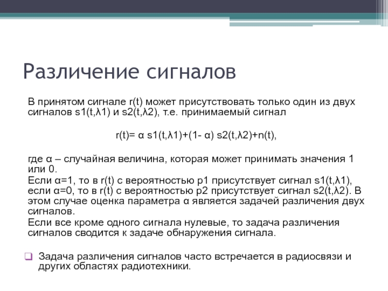 Если α=1, то в r(t) с вероятностью p1 присутствует сигнал s1(t,λ1), если α=0, то в r(t) с вероятностью p2 присутствует сигнал s2(t,λ2). В этом случае оценка параметра α является задачей различения двух сигналов.