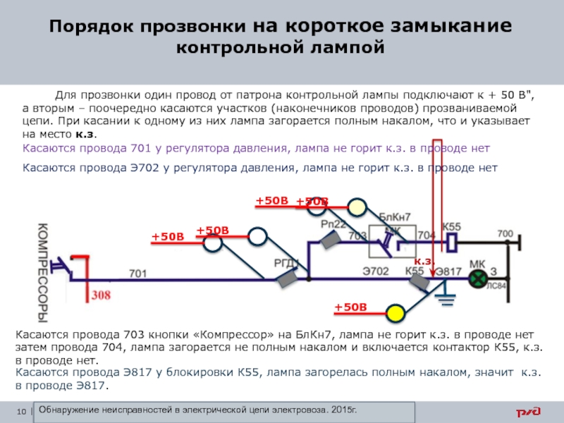 Питания в цепи нет, кнопка «Компрессоры» выключена. Один провод от патрона контрольной лампы подключают к " + 50 В", а вторым – поочередно касаются участков прозваниваемой цепи, начиная со стороны «земли». У катушки К55 касаются провода 700, затем провода 704. Если лампа горит обрыва нет.